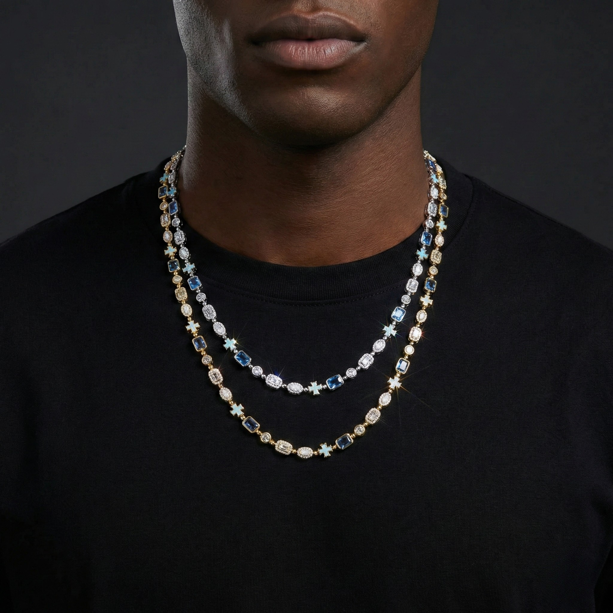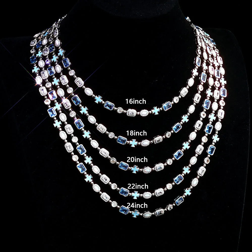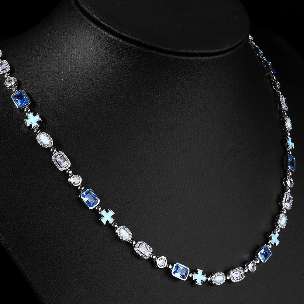 6mm 18K Gold Cross Chain with Diamond Blue Gemstone & Opal Links