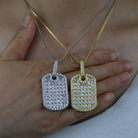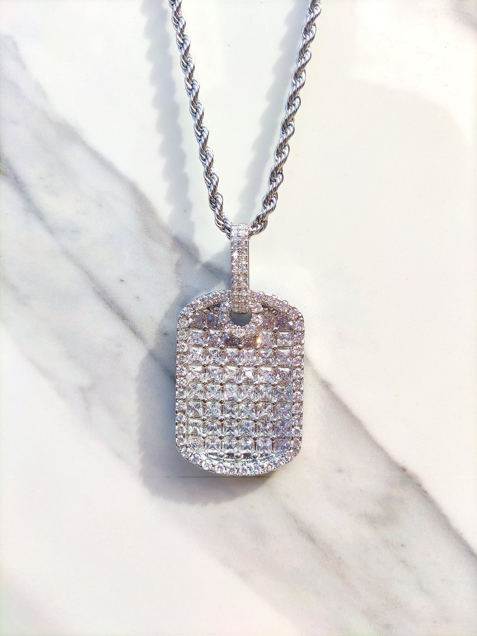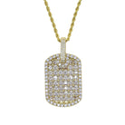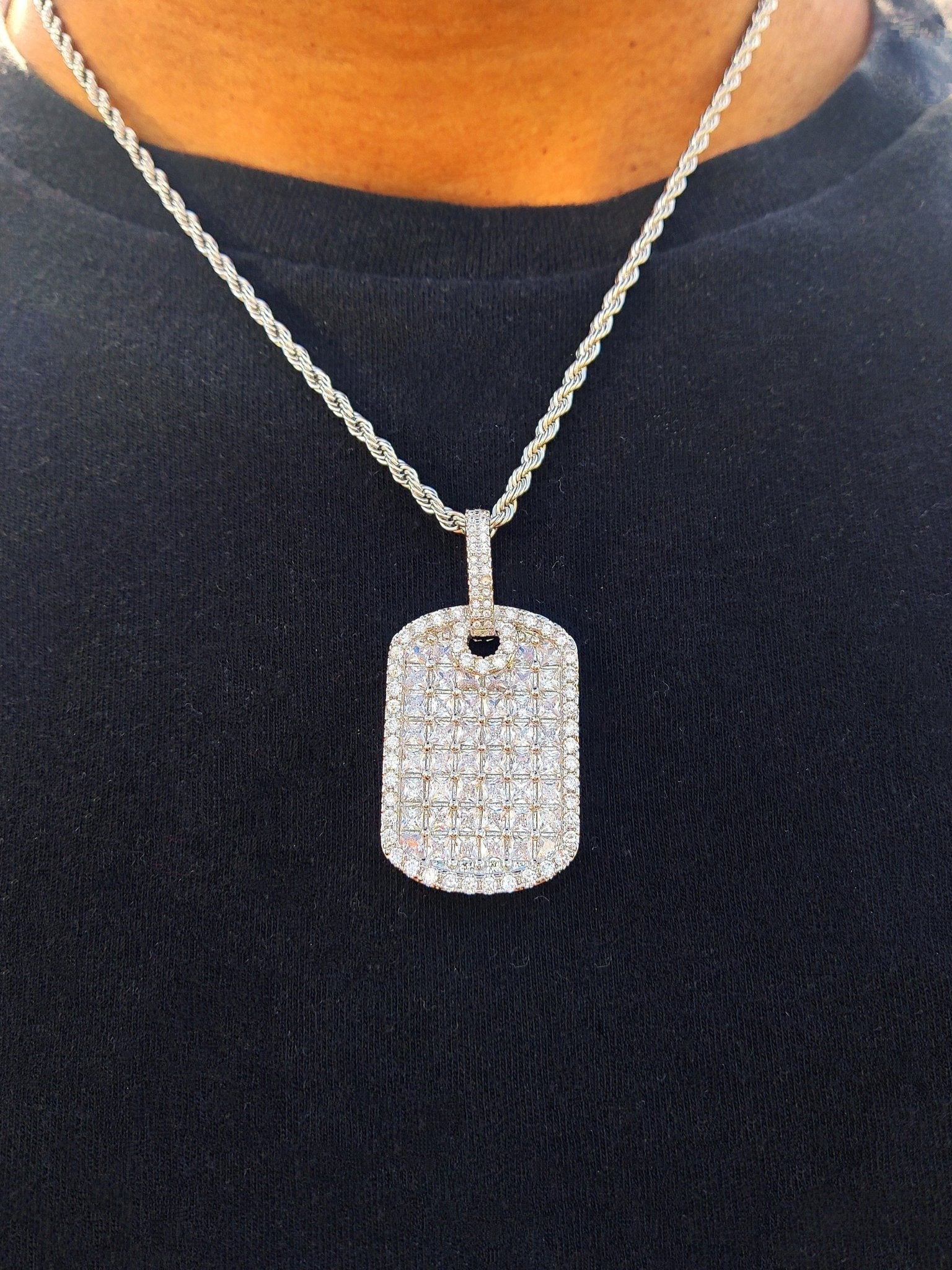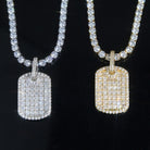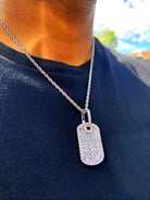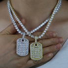 Each piece features a custom dog tag pendant iced with precision-set stones that hit hard in the light. Paired with two high-quality chains, this dog tag necklace set is built for the spotlight — ready to flex straight out of the box.