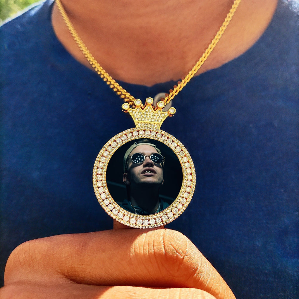 - 2" Custom 18k Gold Diamond Crown Picture Pendant