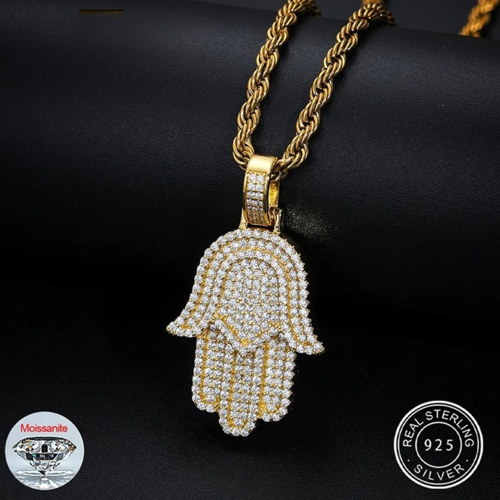 18K Gold Moissanite Diamond Hand of Hamsa Pendant – Iced Out Gold Hamsa Necklace for Protection & Style