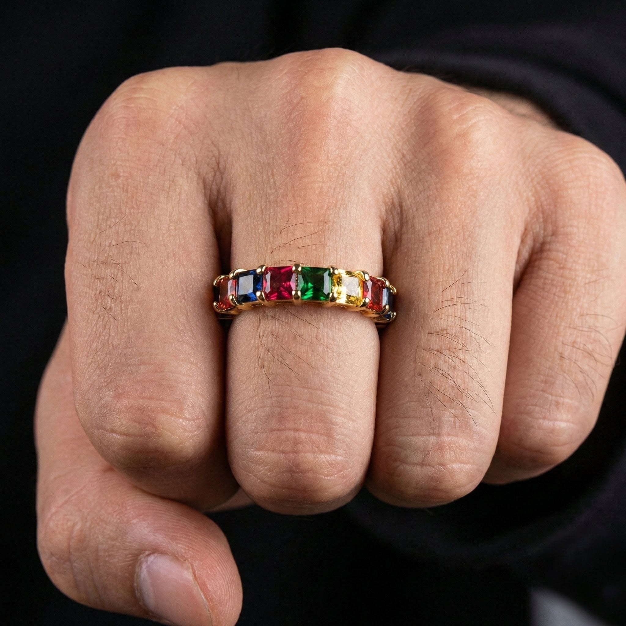 The Multi Coloured Stones Ring is made from high quality 18K Gold Plating for a long lasting and durable shine. The the ring is meticulously covered in different coloured stones for a unique and appealing shine.