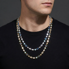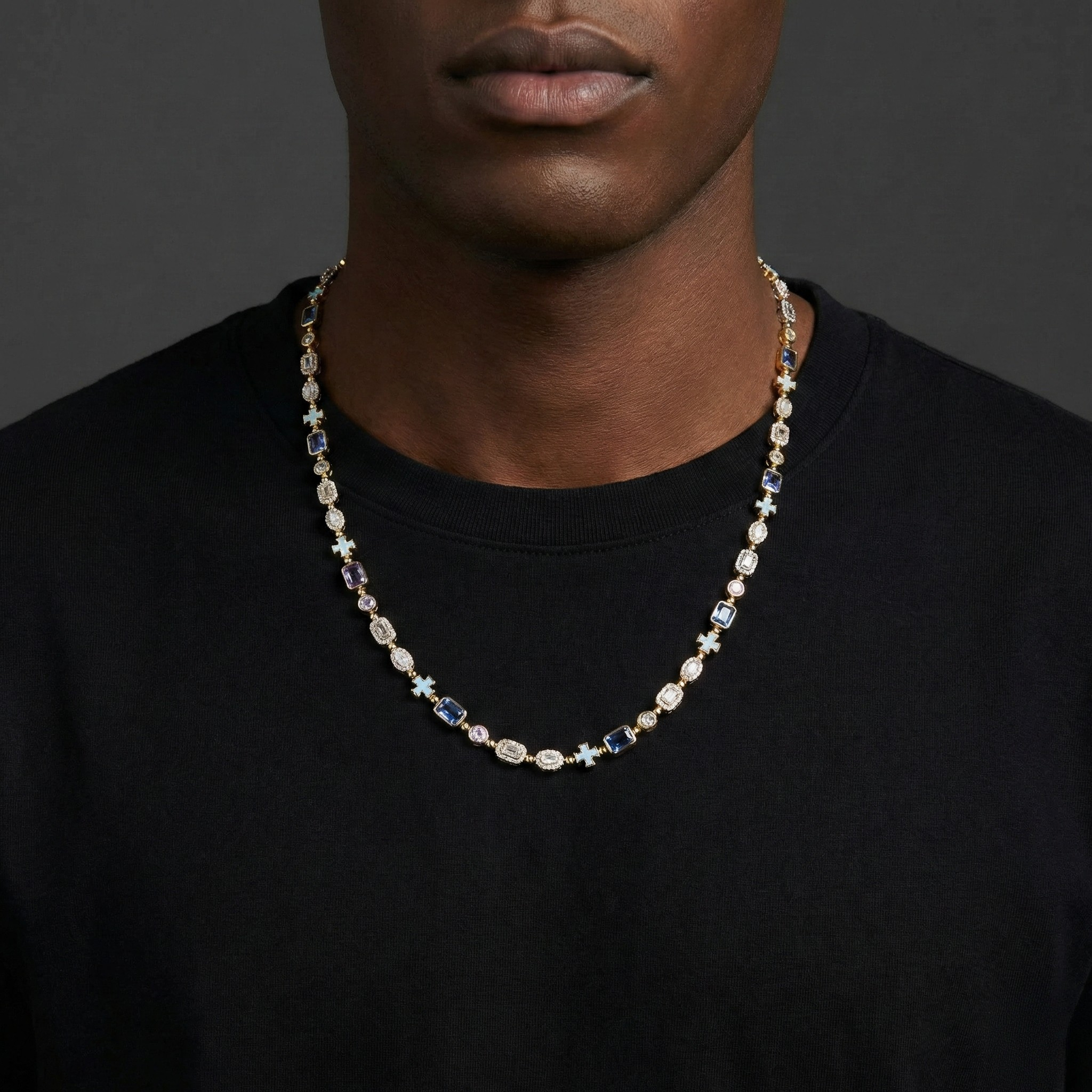 Elevate your style with this 6mm 18k gold cross chain, a true masterpiece of luxury and craftsmanship. Each link alternates between diamond-encrusted blue gemstones, luminous opal pieces, and finely detailed cross charms, creating a bold statement piece that captures attention from every angle.