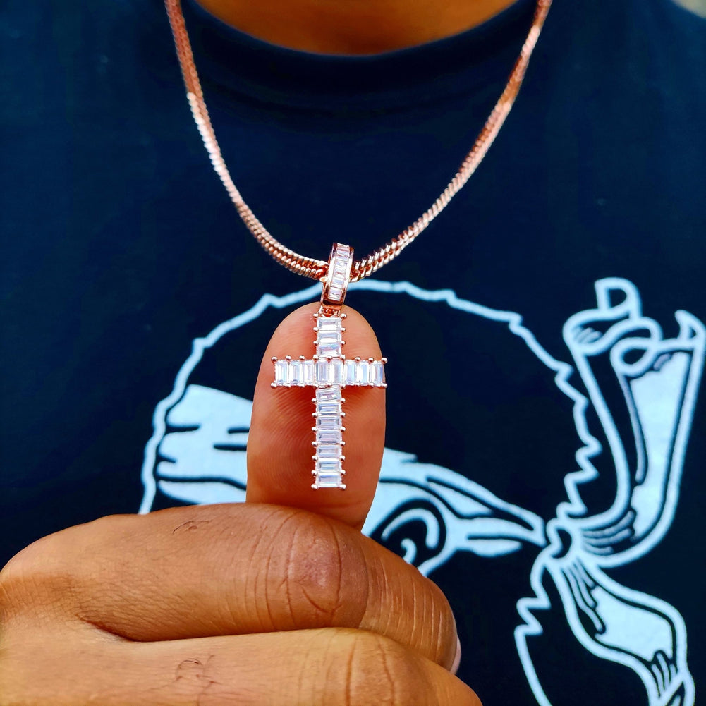 The 18K Gold Baguette Cross is made from high quality 18K Gold Plating and is dipped 5 times for a long lasting and durable shine. The Cross is then filled with large Cubic Zirconia Baguette Style Diamonds.