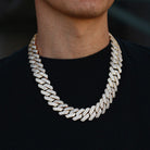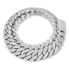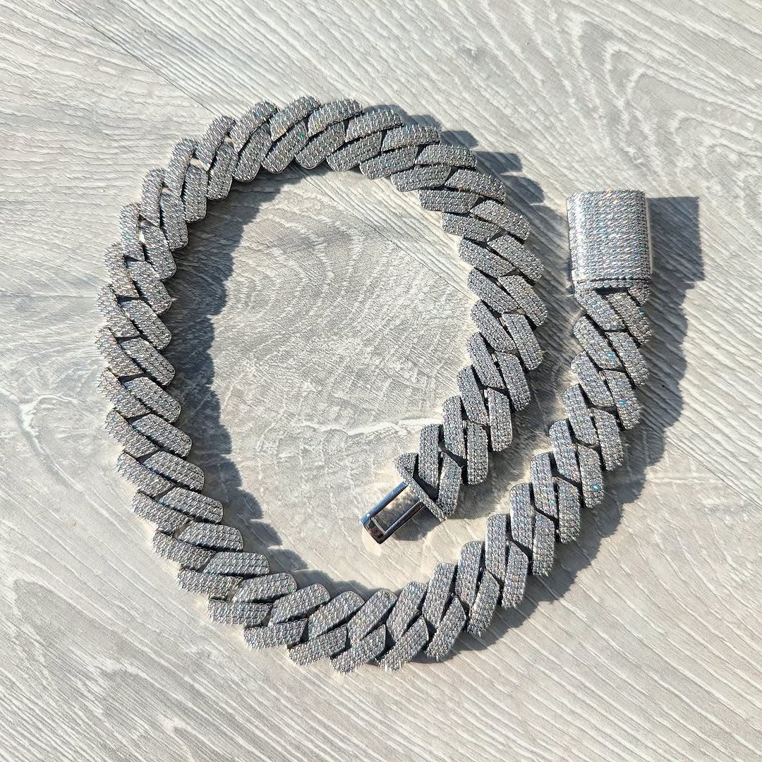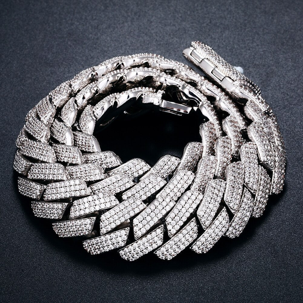 At 20mm in width, this chain is a statement piece that demands attention. The prong-set diamonds that adorn the links are of exceptional quality, adding a memorizing shine that will light up any room.