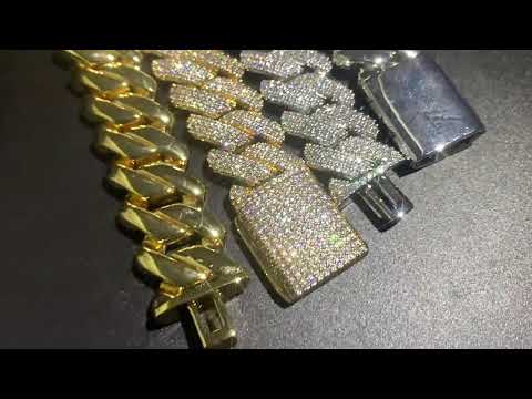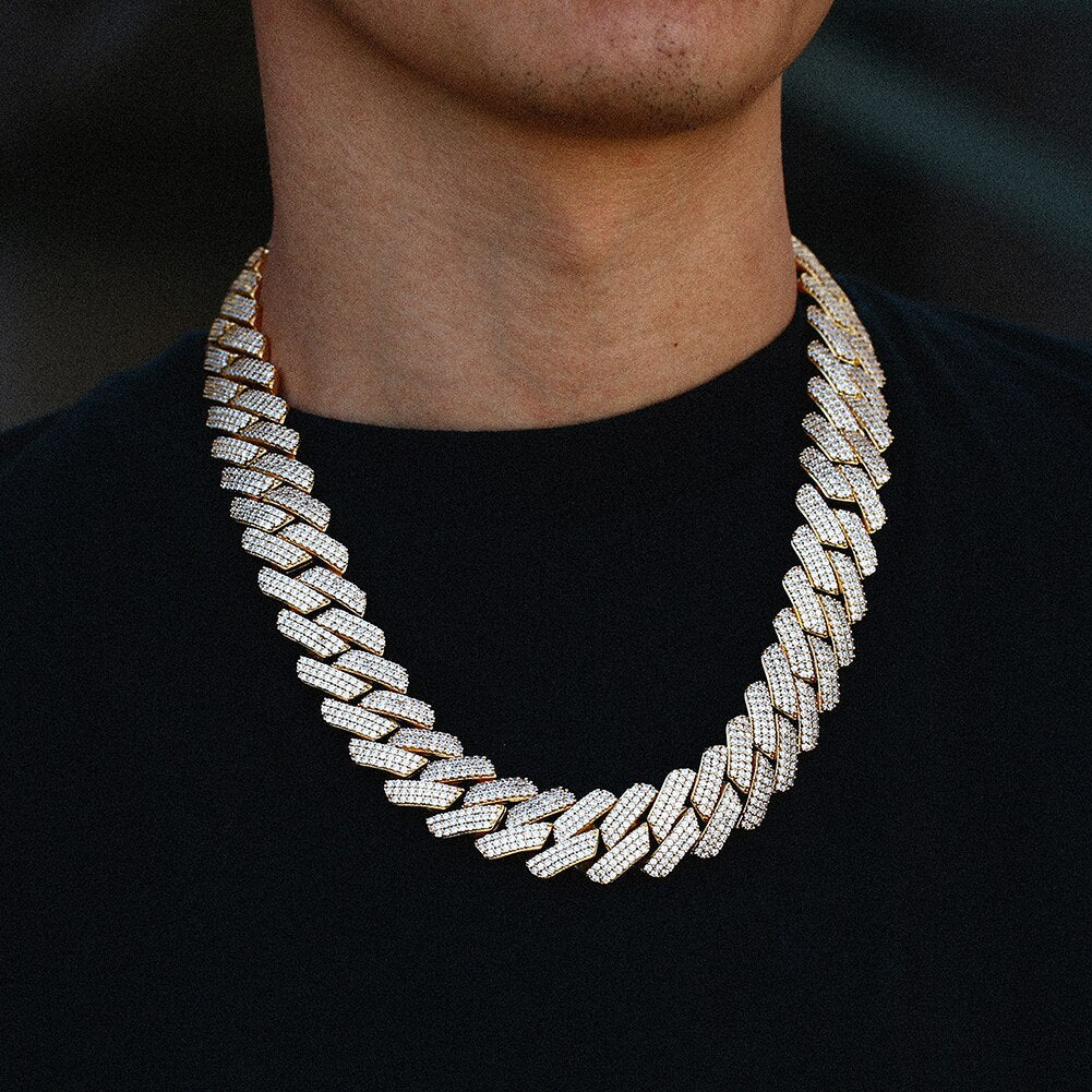 The luxurious 18k Gold Diamond 20mm Prong Cuban Link Chain, a stunning piece of jewelry that exudes opulence and style. Expertly crafted from high-quality 18k gold, this chain is designed to catch the eye and turn heads wherever you go.