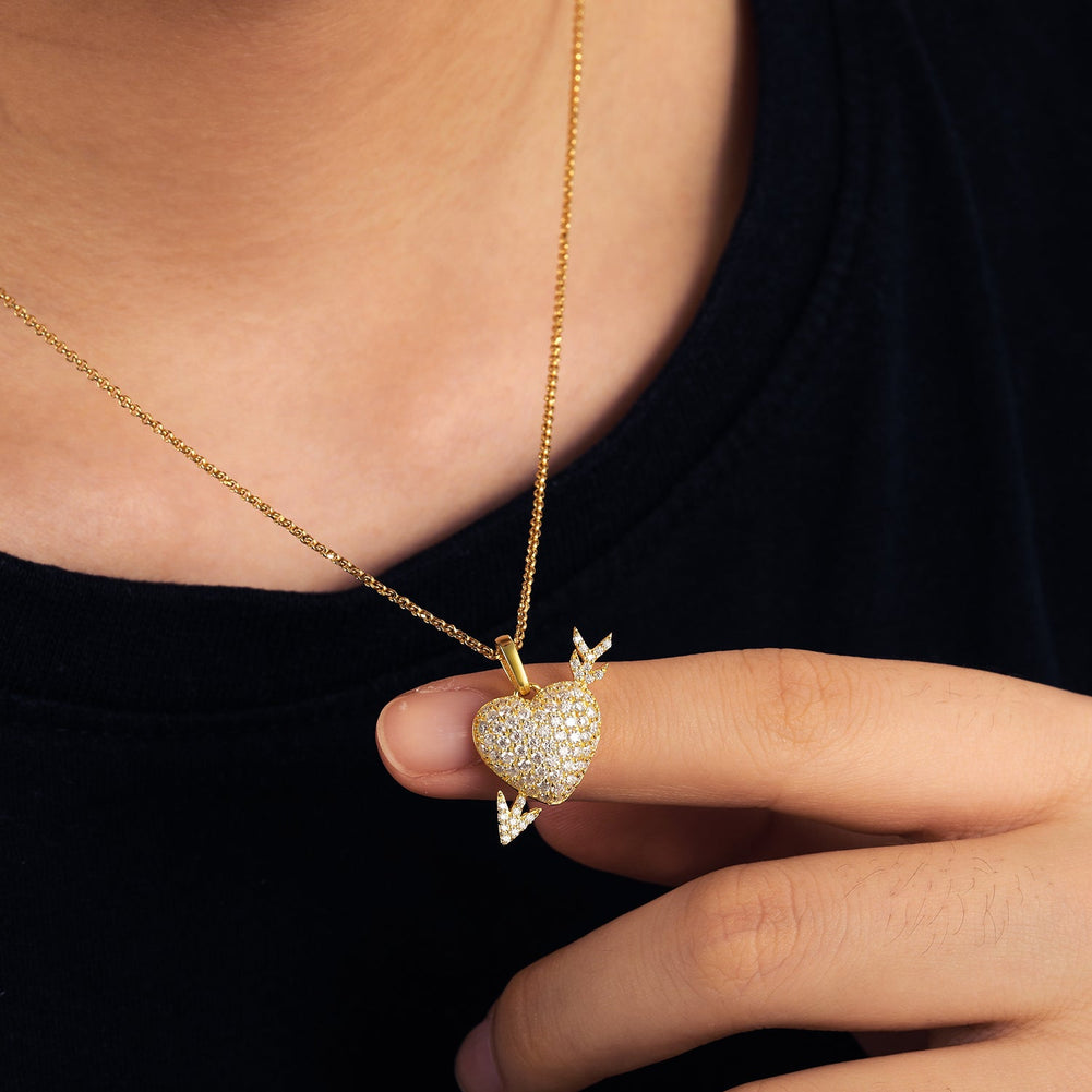 Crafted from the finest 18k gold or .925 silver, this pendant features a brilliant heart-shaped pendant, covered by moissanite diamonds that shine and shimmer in the light. A delicate arrow pierces through the heart, symbolizing the powerful force that drives us to seek out true love and connection.