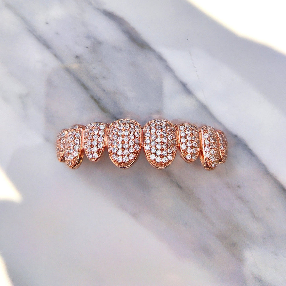 The Premium 18K Gold Diamond Grillz are made from high quality 18K Gold Plating dipped 8 times for a premium shine. Each tooth is flooded with prong set Cubic Zirconia Diamonds.