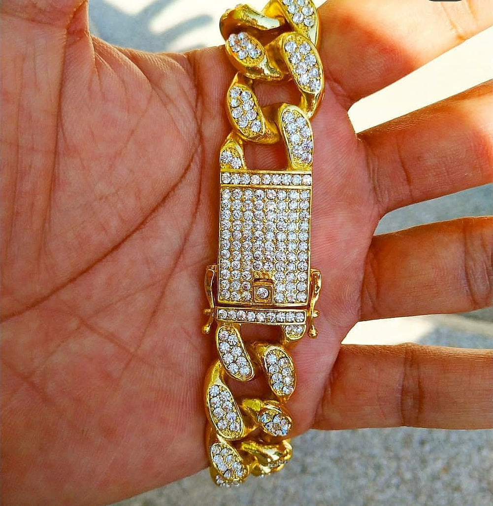 The Cz Diamond Miami Cuban Link chain is finely crafted by hand using high quality 18k Gold Plating for a long lasting and durable shine, then each Cuban link is flooded with stunning Cz diamonds sun glasses may be required.