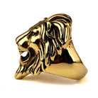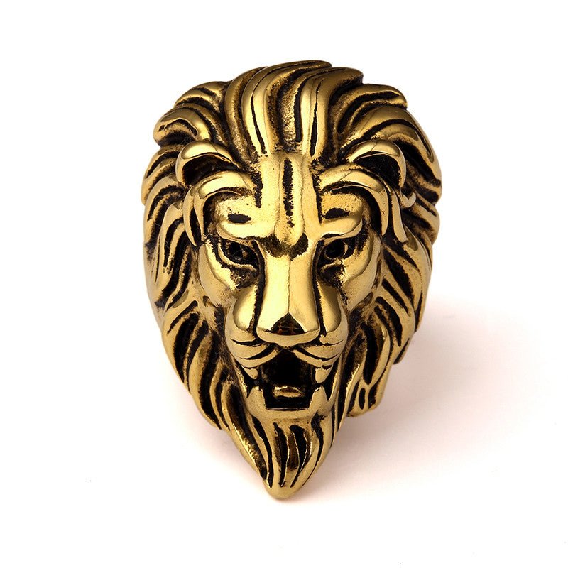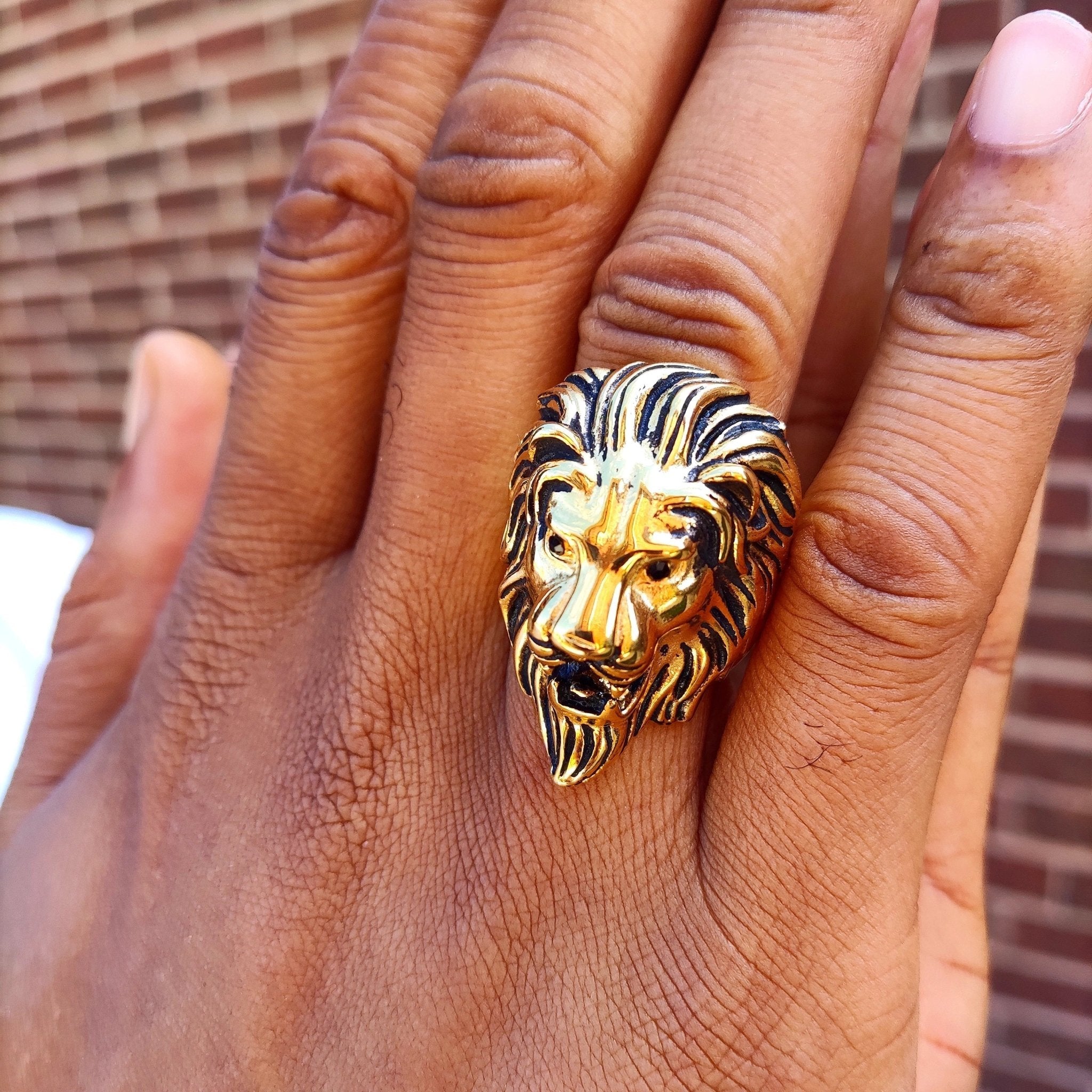 Demuestra tu fuerza con este poderoso anillo de cabeza de león chapado en oro de 18 quilates.