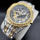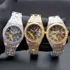 ¡El mundo es tuyo! Deje que su éxito hable a través del reloj magnate de diamantes y baguette de oro de 18 quilates. Un reloj de primera calidad que contará la historia de su éxito y completará su look al mismo tiempo. Diseñado con movimiento mecánico para que nunca necesite una batería. Fabricado con oro real de 18 quilates y completamente cubierto con diamantes CZ de grado VVS para un brillo absolutamente brillante.