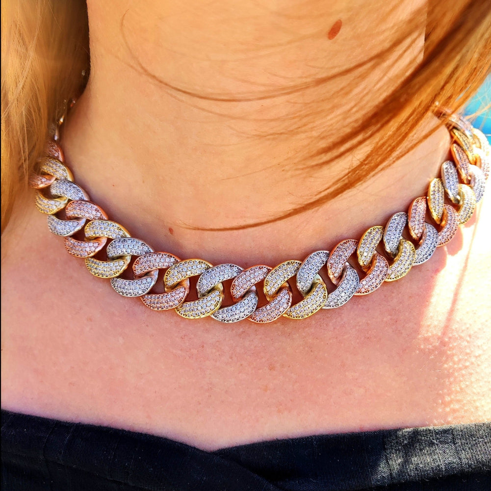 La chaîne à maillons cubains Miami en or 18 carats tricolore et diamants est fabriquée à la main avec précision à partir d'or 18 carats, plaqué or rose et or blanc de la plus haute qualité. Chaque maillon est orné de superbes diamants en zircon cubique sertis griffes pour un éclat incomparable.